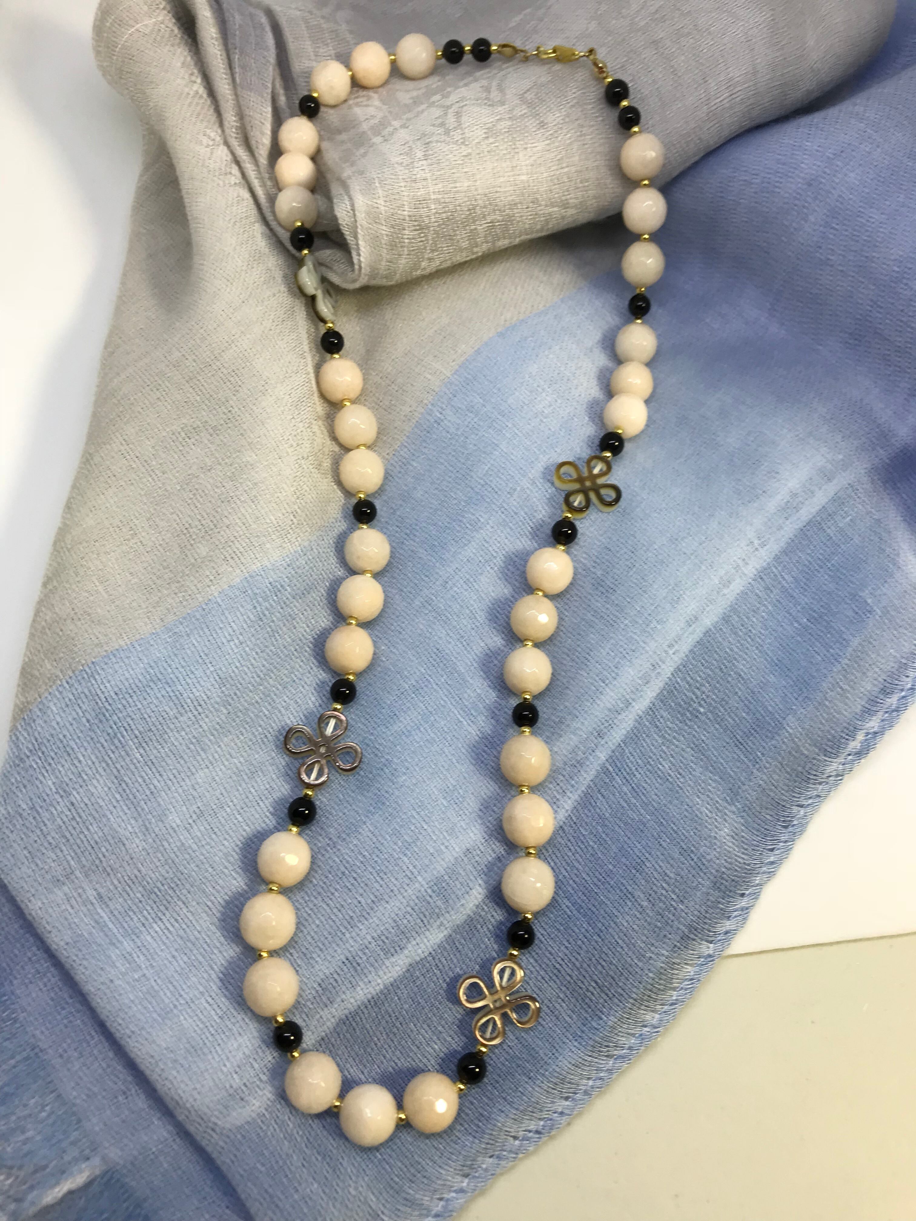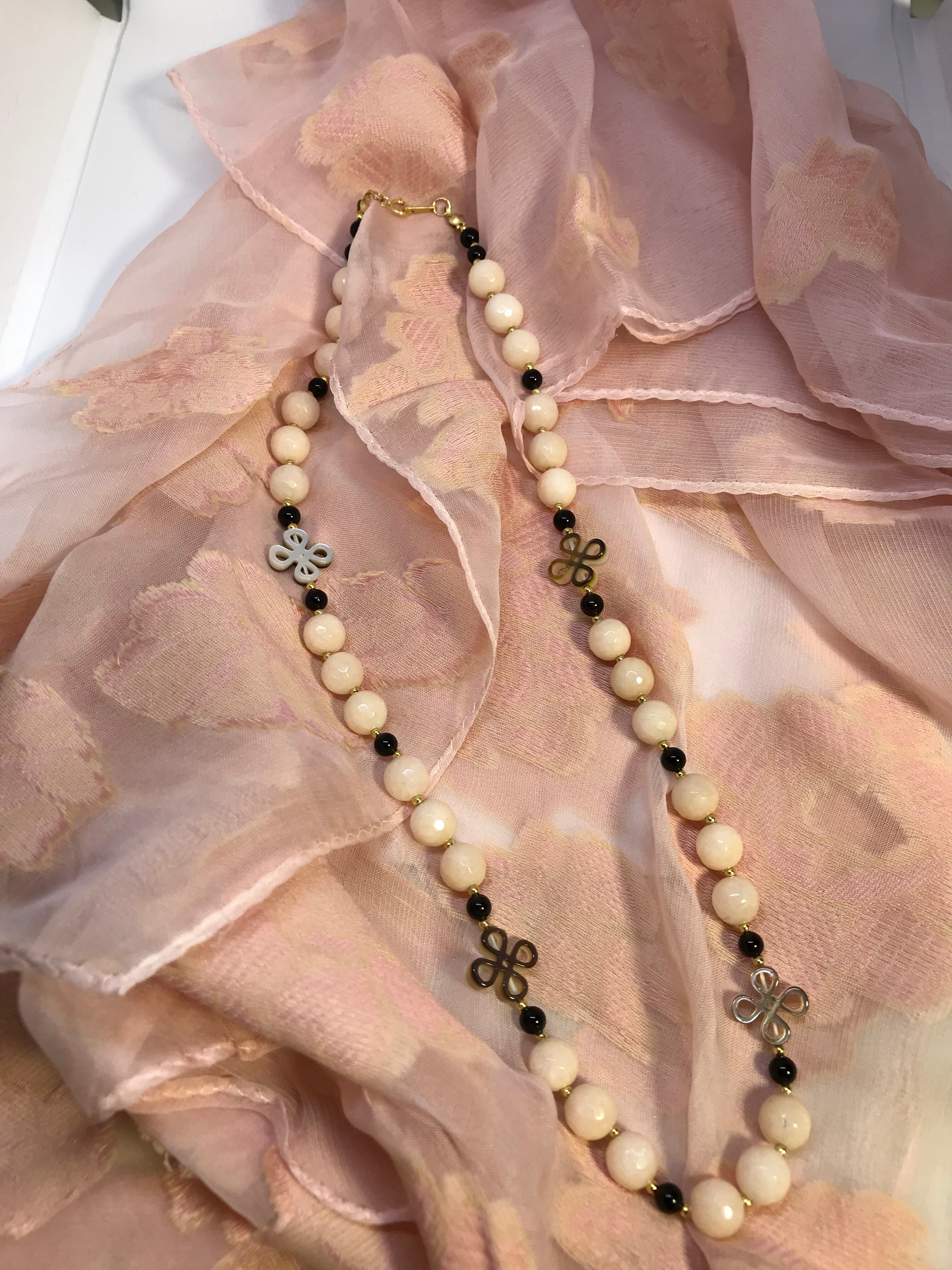 このネックレスは一点もので、透かし貝シェルとミルキーベージュジェードが見事に組み合わさり、独特な魅力を持つネックレスとなりました。こだわり抜かれた素材やデザインから、その美しさと高品質が伺えます。